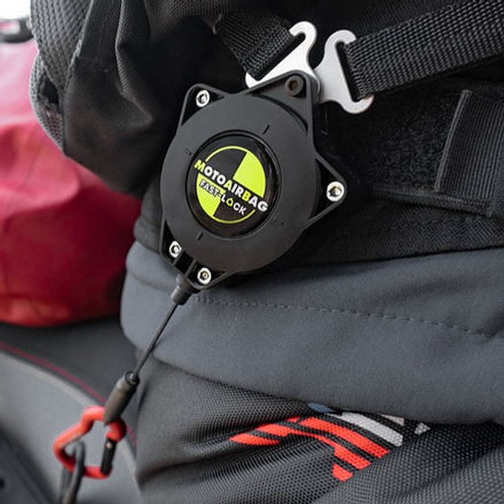 Il classico cavo di attivazione di MOTOAIRBAG® viene sostituito dal FAST LOCK che come un arrotolatore della cintura di sicurezza mantiene il cavo sempre in tensione, ma libero di scorrere.