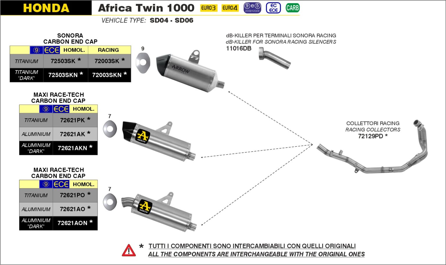 Per Honda Africa Twin 1000 dal 2016 al 2019 è compatibile con il Collettore Racing in Acciaio inox Arrow 72129PD