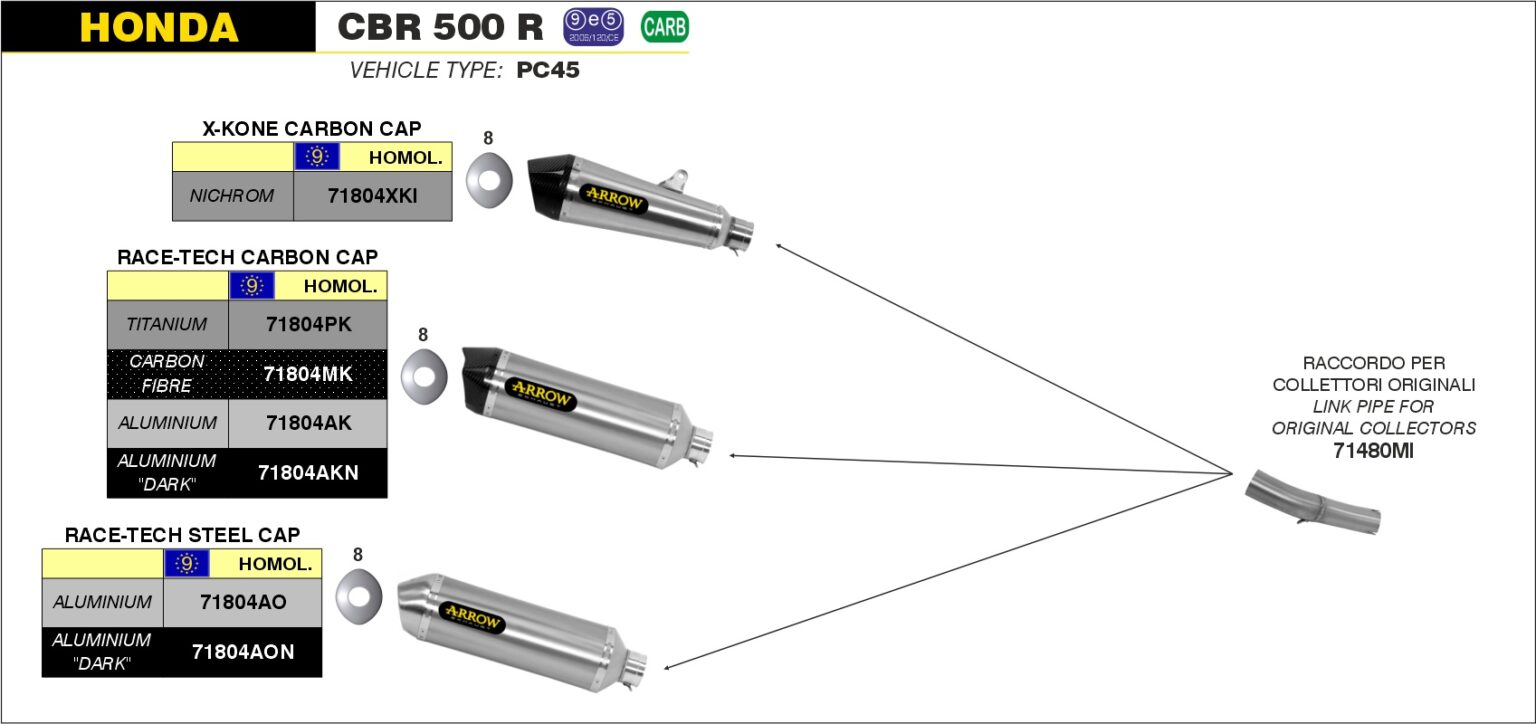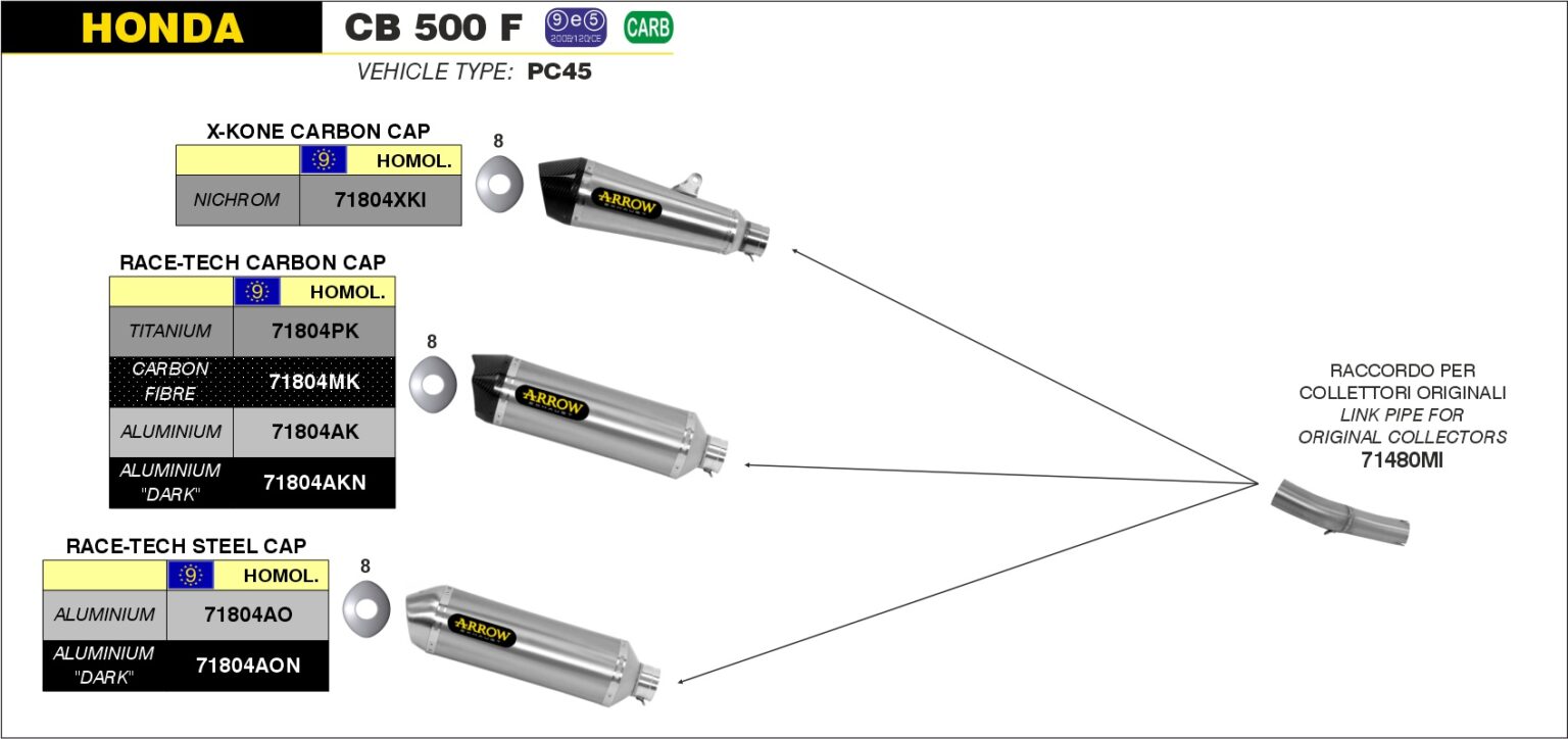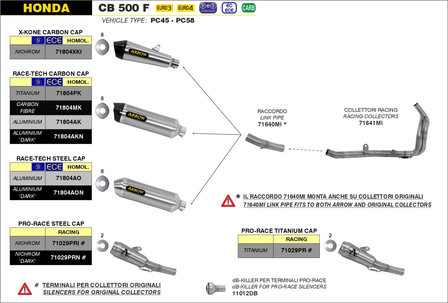 Per Honda CB 500 F – CBR 500 R dal 2016 al 2018 il terminale è Compatibile con il collettore racing Arrow 71641MI per il corretto montaggio è obbligatorio acquistare il