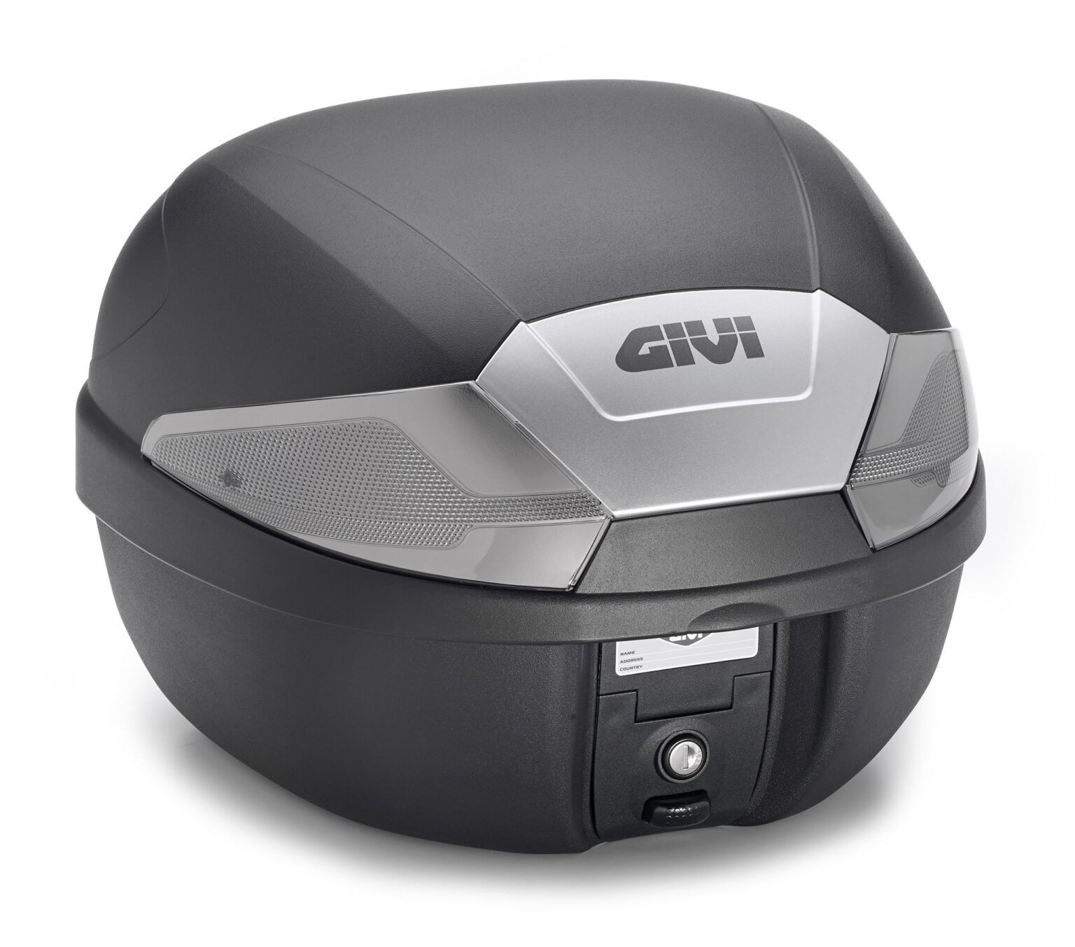 Bauletto Givi Monolock B29 da 29 lt nero goffrato con catadiottri fumè. Può contenere un casco integrale o modulare.