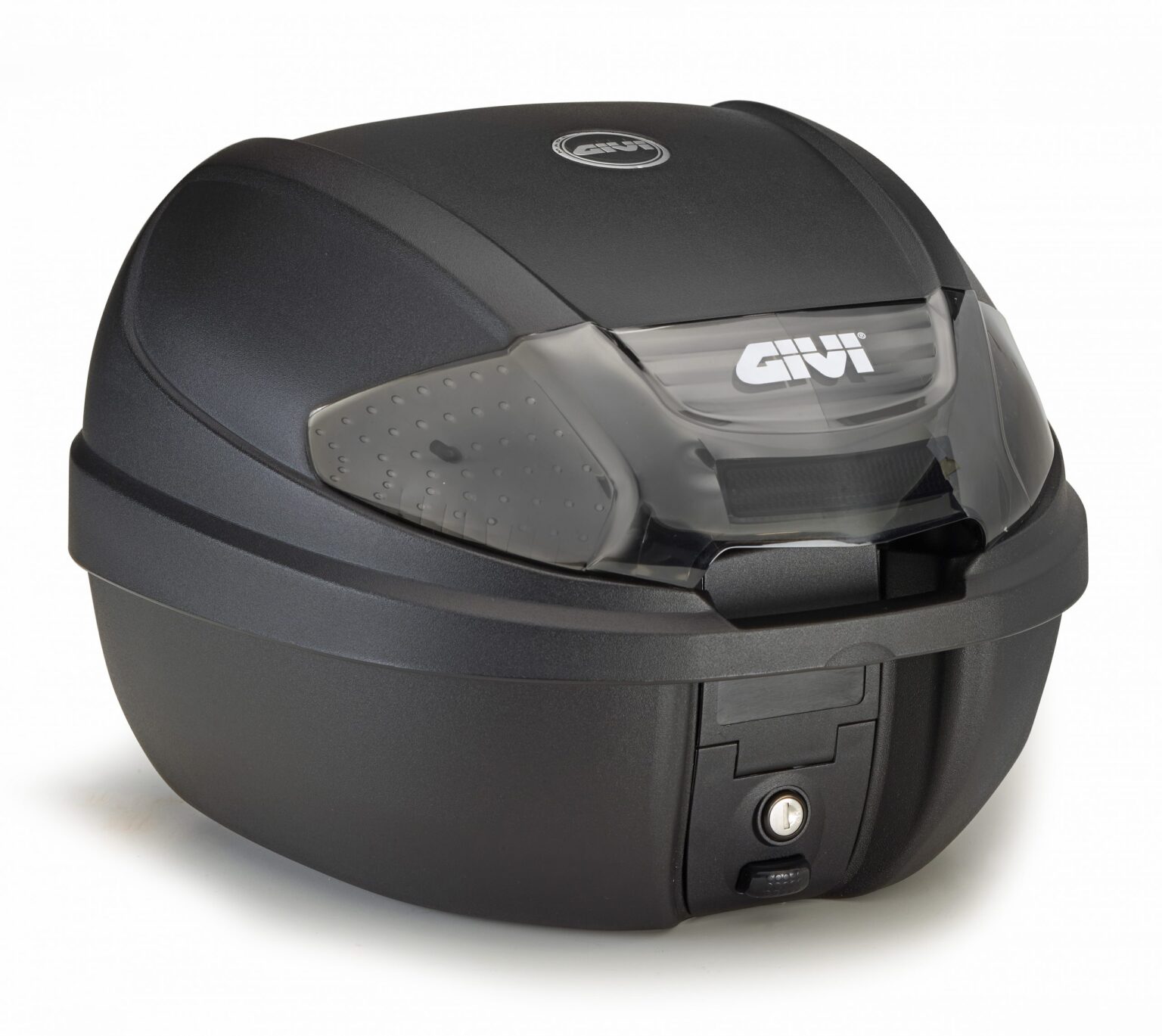 Bauletto Givi Monolock E300N2 da 30 lt nero goffrato con catadiottri fumè. Può contenere un casco integrale o modulare.