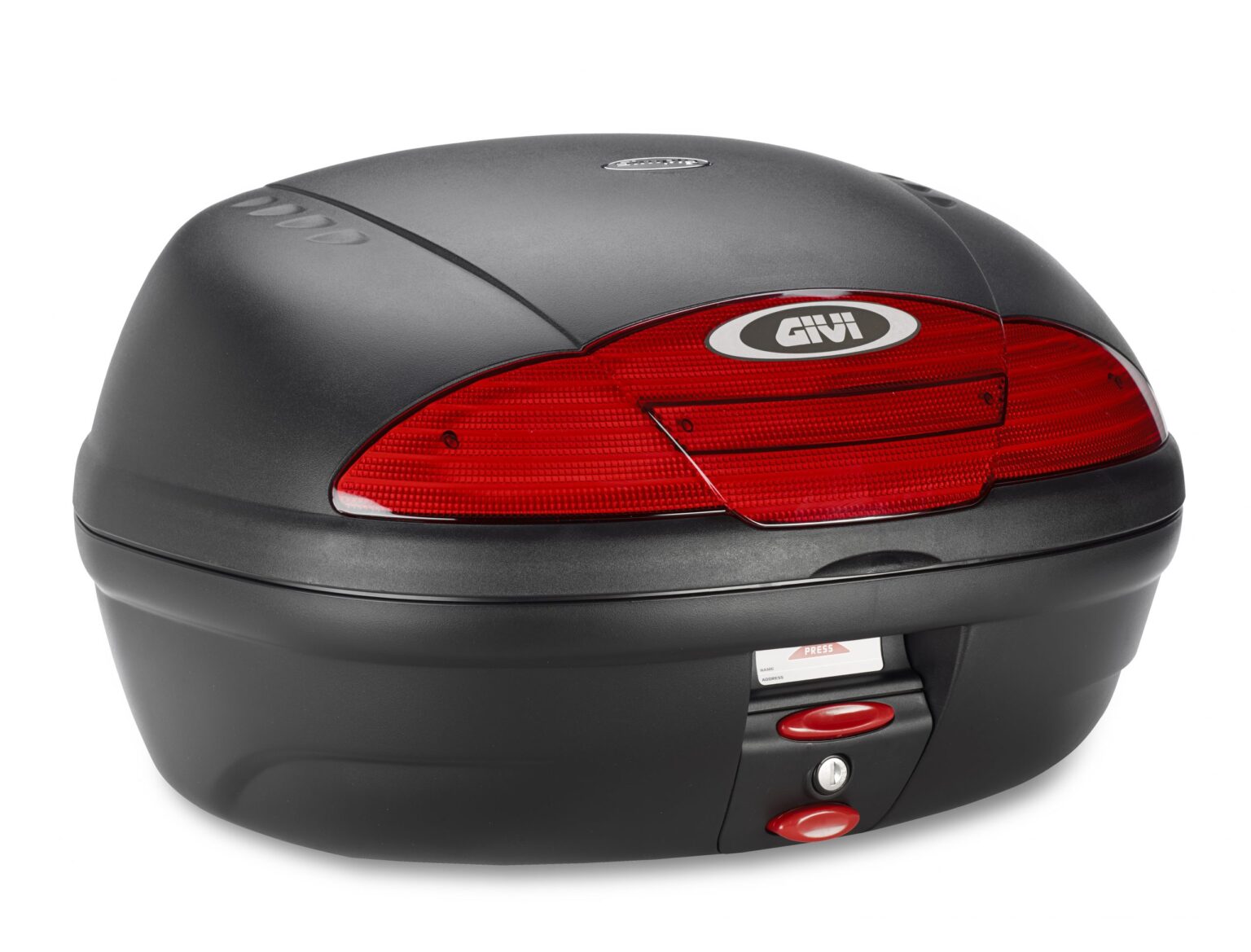 Bauletto Givi E450 Simply II da 45 lt nero goffrato con catadiottri rossi.