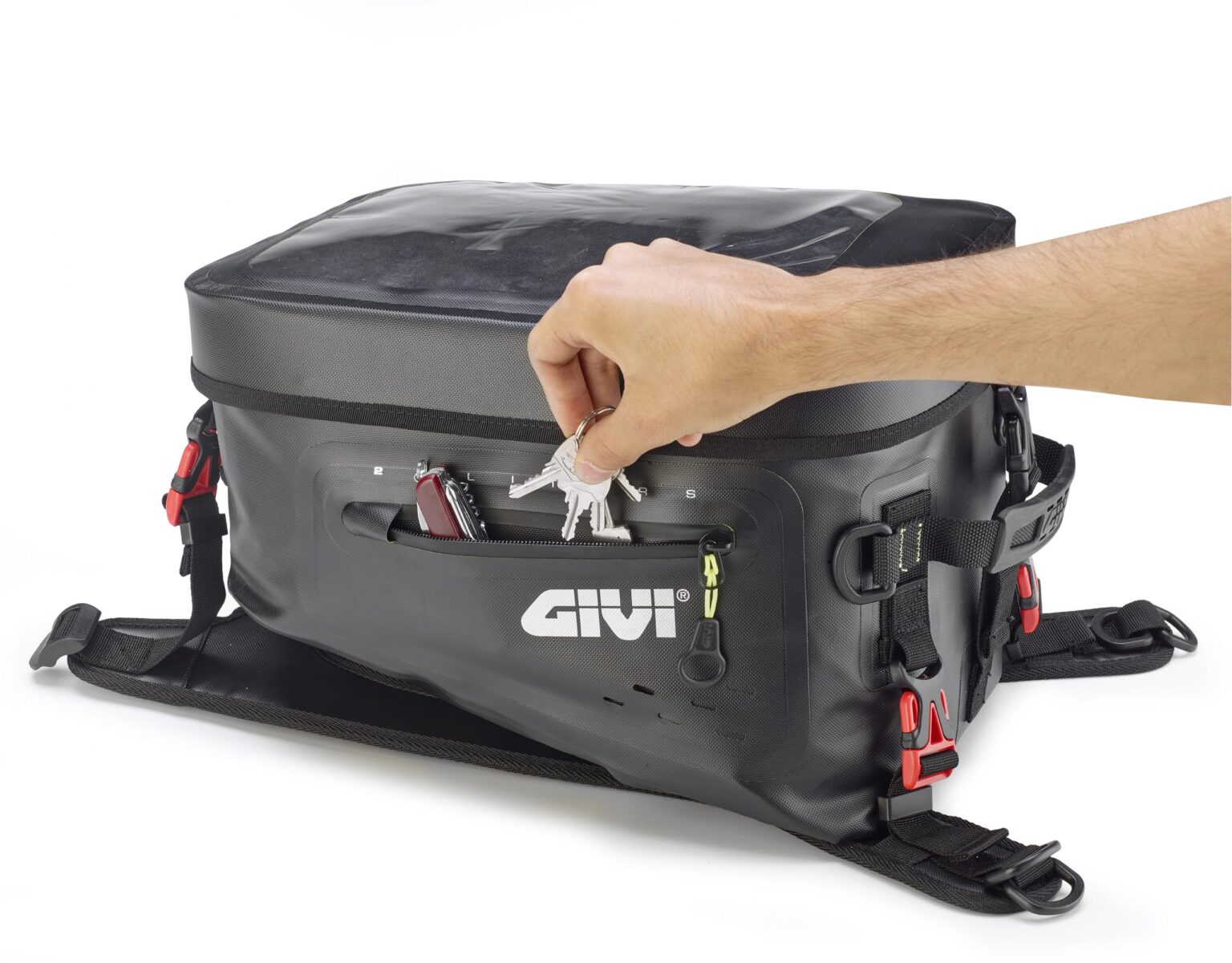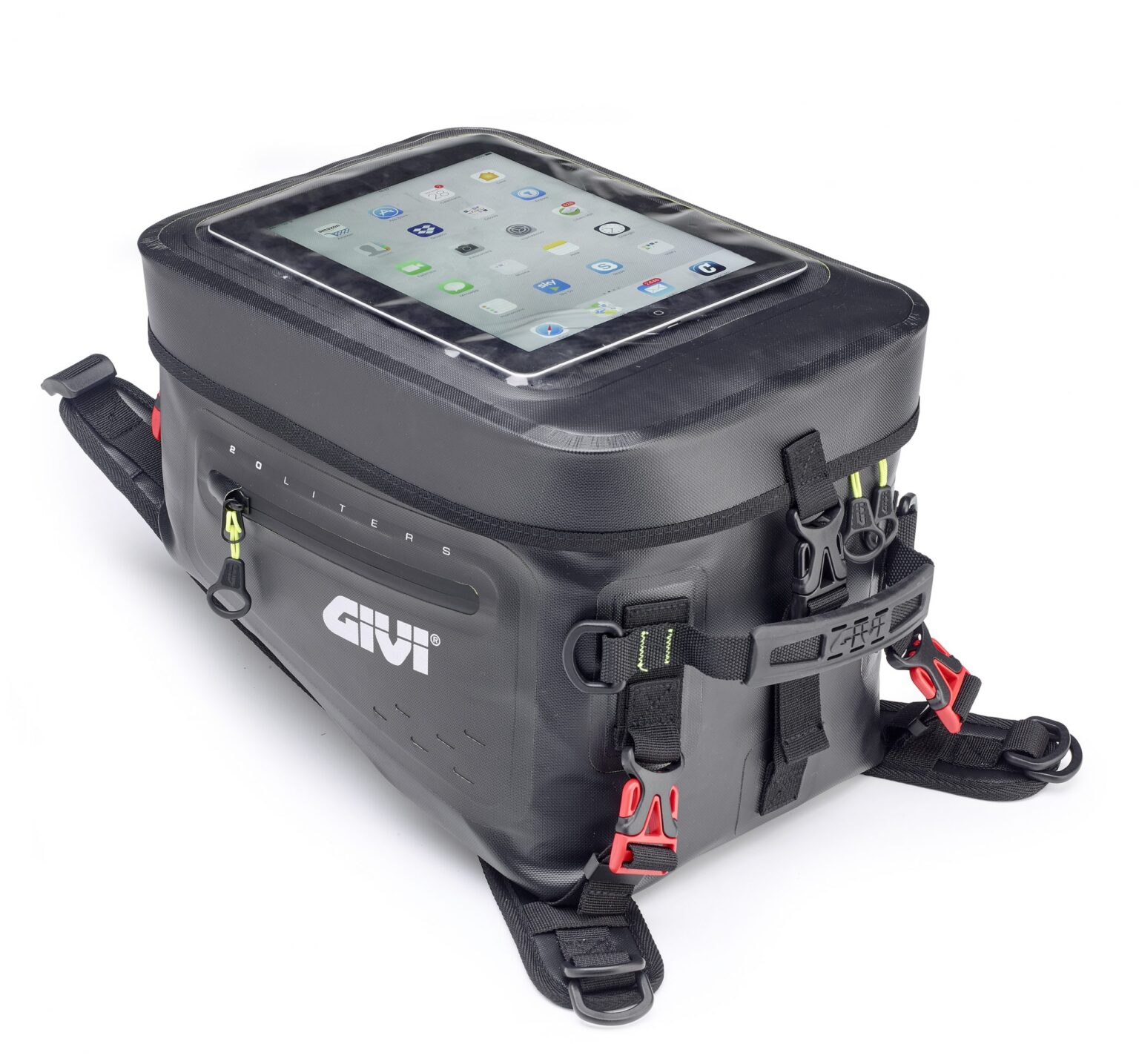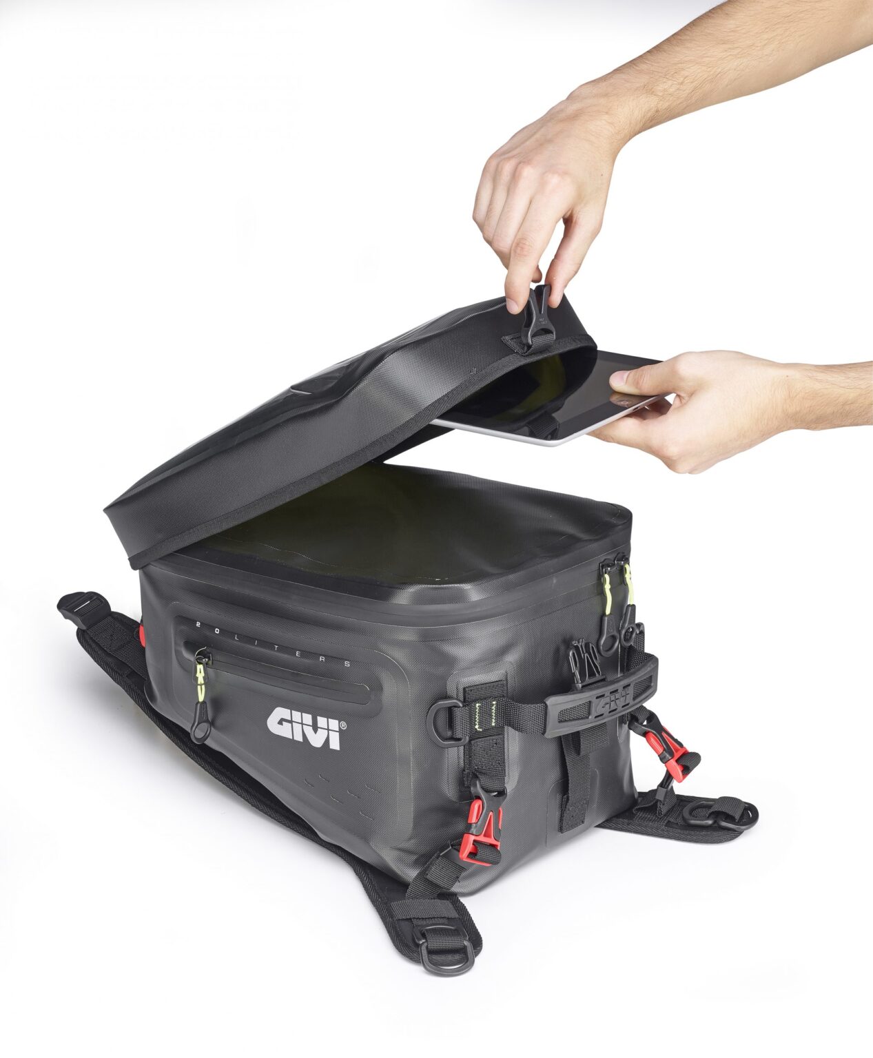 Borsa serbatoio waterproof nera, 20 litri, con interno di colore giallo dotata di base specifica per aggancio e sgancio rapido.