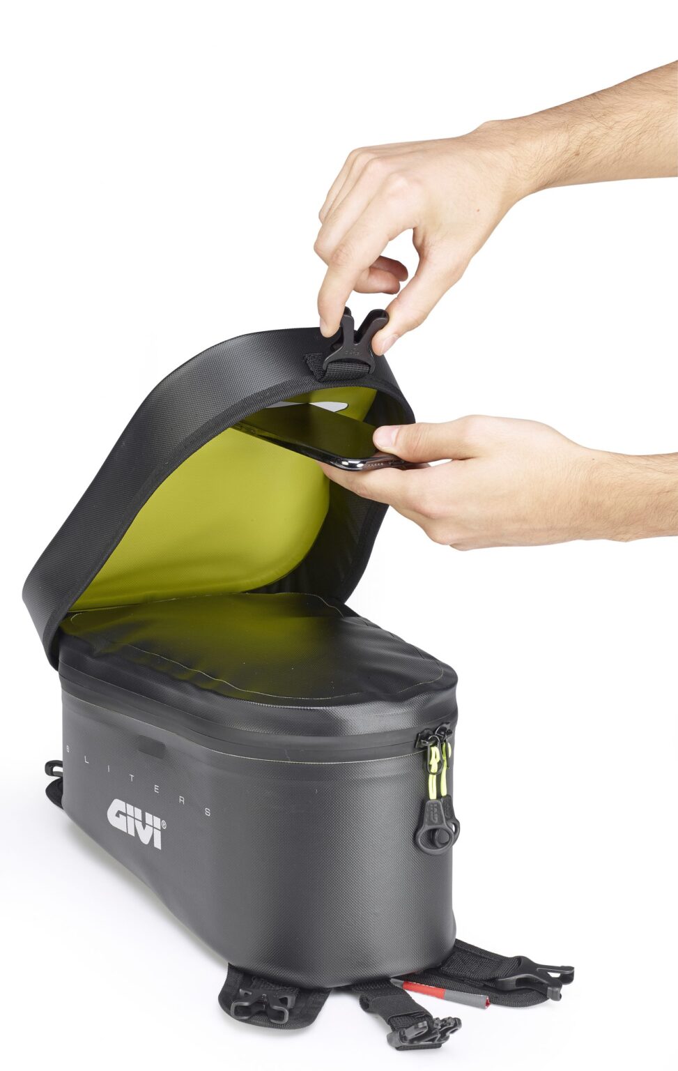 • 840D Nylon TPU (doppia spalmatura). Resistente a strappi e saldato ad alta frequenza, senza cuciture, per garantire massima impermeabilità . • Stampe riflettenti per una maggiore visibilità • Tasca trasparente porta tablet o cartina • Chiusura con cerniera water resistant dotata di coperchio antiacqua per una maggiore protezione • Interni rinforzati per conferire maggior sostegno alla struttura della borsa • Sistema di fissaggio su serbatoio tramite cinghie incluse • Base antiscivolo